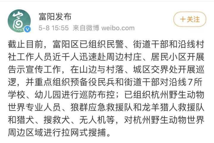 @富阳发布 称:截止目前,富阳区已组织民警、街道干部和沿线村社工作人员近千人迅速赴周边村庄、居民小区开展告示宣传工作,在山边与村落、城区交界处开展巡逻,并重点组织预备役民兵和街道干部对沿线7所学校、幼儿园进行巡防布控;已组织杭州野生动物世界专业人员、狼群应急救援队和龙羊猎人救援队和猎犬、搜救犬、无人机等,对杭州野生动物世界周边区域进行拉网式搜捕。