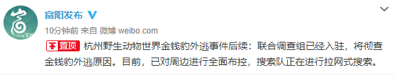 杭州野生动物世界金钱豹外逃事件后续:联合调查组已经入驻,将彻查金钱豹外逃原因。目前,已对周边进行全面布控,搜索队正在进行拉网式搜索。