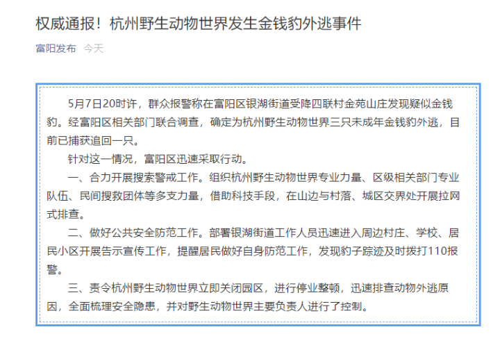 三、责令杭州野生动物世界立即关闭园区,进行停业整顿,迅速排查动物外逃原因,全面梳理安全隐患,并对野生动物世界主要负责人进行了控制。