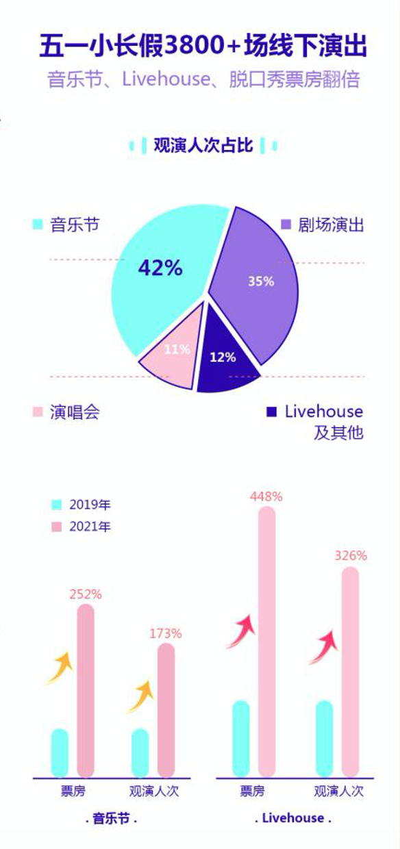从细分市场来看,音乐类、剧场类、曲苑杂谈等各类演出供给丰富,票房增速明显。票务平台大麦发布的《2021五一档演出观察》显示,今年“五一”假期期间,全国共有逾3800场线下专业演出先后登场,与2019年同期相比,包括Livehouse、脱口秀、音乐节在内的多类演出票房增幅超250%。