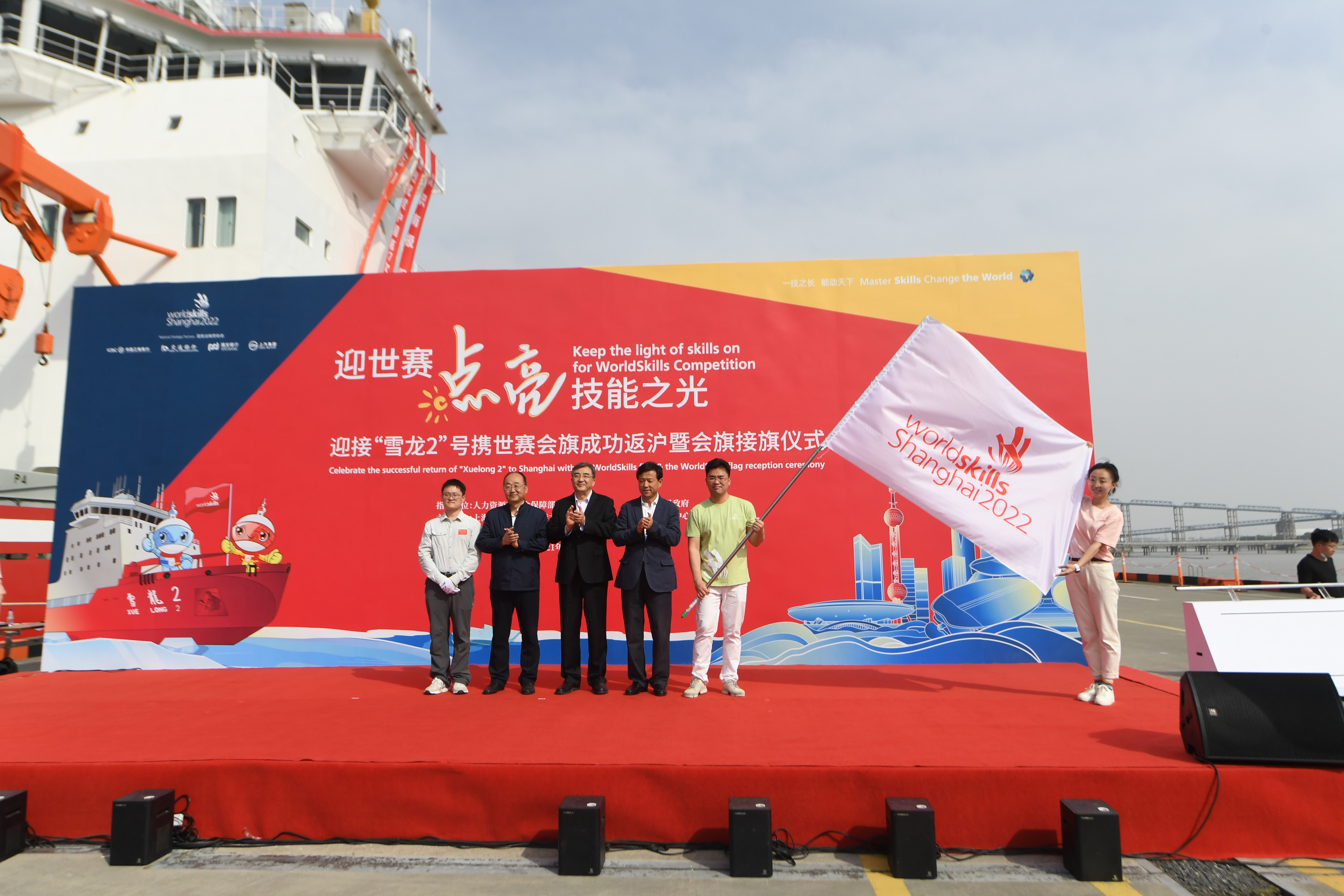 上海2022年第46届世界技能大赛会旗搭乘“雪龙2”号极地科考船,5月7日顺利完成南极展示任务返回上海。8日,中国极地考察国内基地举行了世赛会旗接旗仪式,人社部和上海市政府相关负责人出席了仪式。
