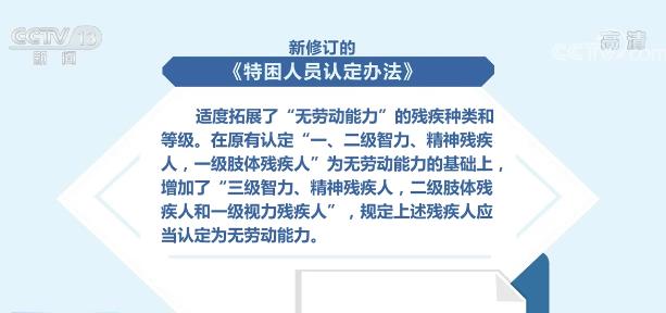 新修订的《特困人员认定办法》适度拓展了“无劳动能力”的残疾种类和等级。在原有认定“一、二级智力、精神残疾人,一级肢体残疾人”为无劳动能力的基础上,增加了“三级智力、精神残疾人,二级肢体残疾人和一级视力残疾人”,规定上述残疾人应当认定为无劳动能力。
