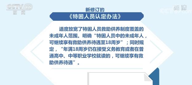 适度放宽了特困人员救助供养制度覆盖的未成年人范围。明确“特困人员中的未成年人,可继续享有救助供养待遇至18周岁”;同时规定,“年满18周岁仍在接受义务教育或者在普通高中、中等职业学校就读的,可继续享有救助供养待遇”。
