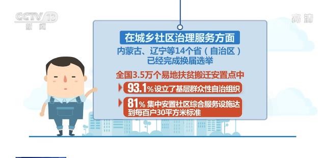 另外,在城乡社区治理服务方面,目前,内蒙古、辽宁等14个省(自治区)已经完成换届选举。全国3.5万个易地扶贫搬迁安置点中,93.1%设立了基层群众性自治组织,81%集中安置社区综合服务设施达到每百户30平方米标准。