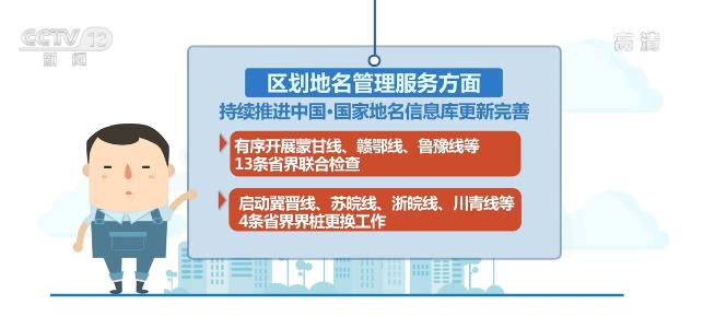 区划地名管理服务方面,持续推进中国国家地名信息库更新完善。有序开展蒙甘线、赣鄂线、鲁豫线等13条省界联合检查,启动冀晋线、苏皖线、浙皖线、川青线等4条省界界桩更换工作。