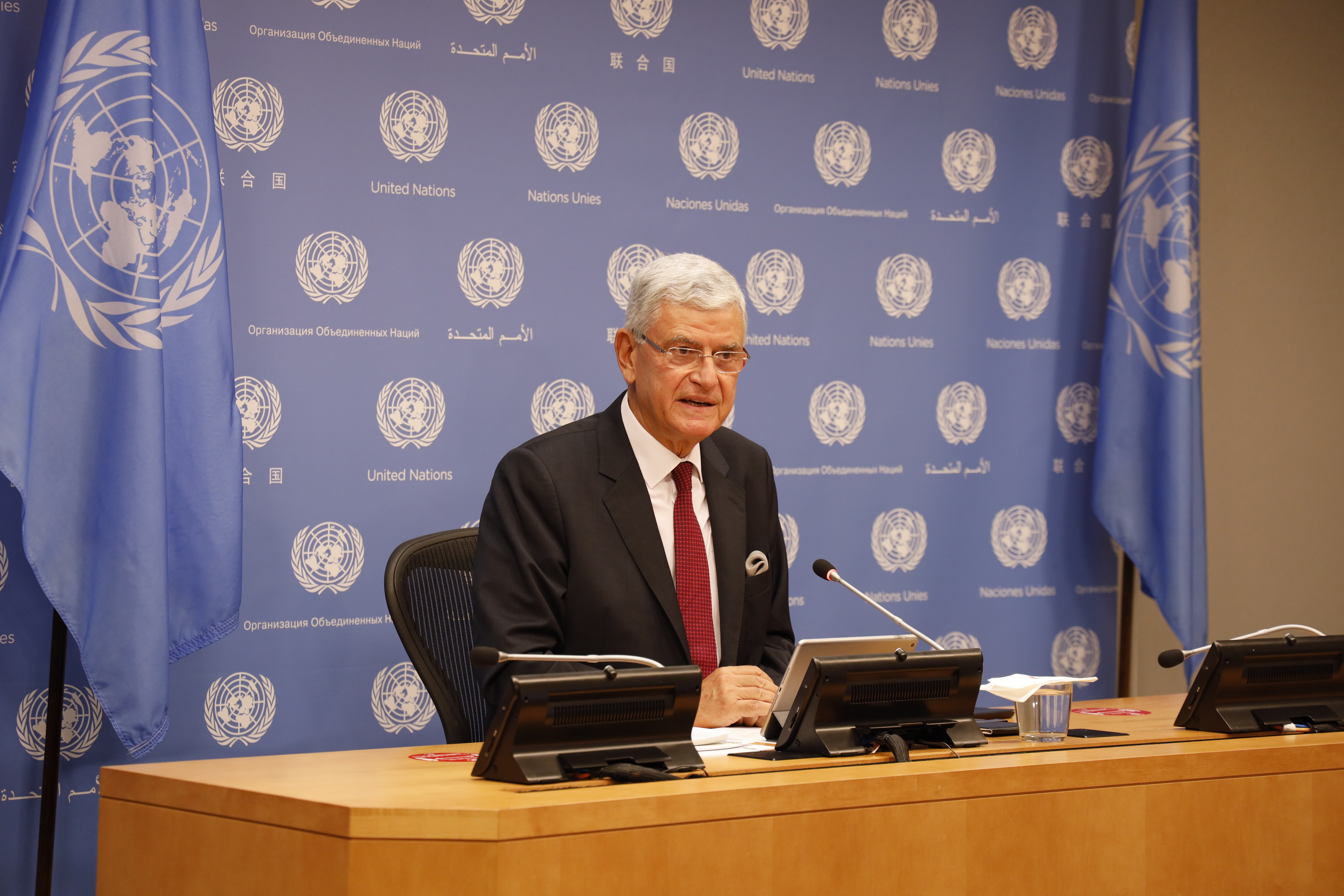 2020年9月15日,在位于纽约的联合国总部,第75届联合国大会主席沃尔坎·博兹克尔在第75届联大开幕后的记者会上讲话。(新华社记者谢锷摄)