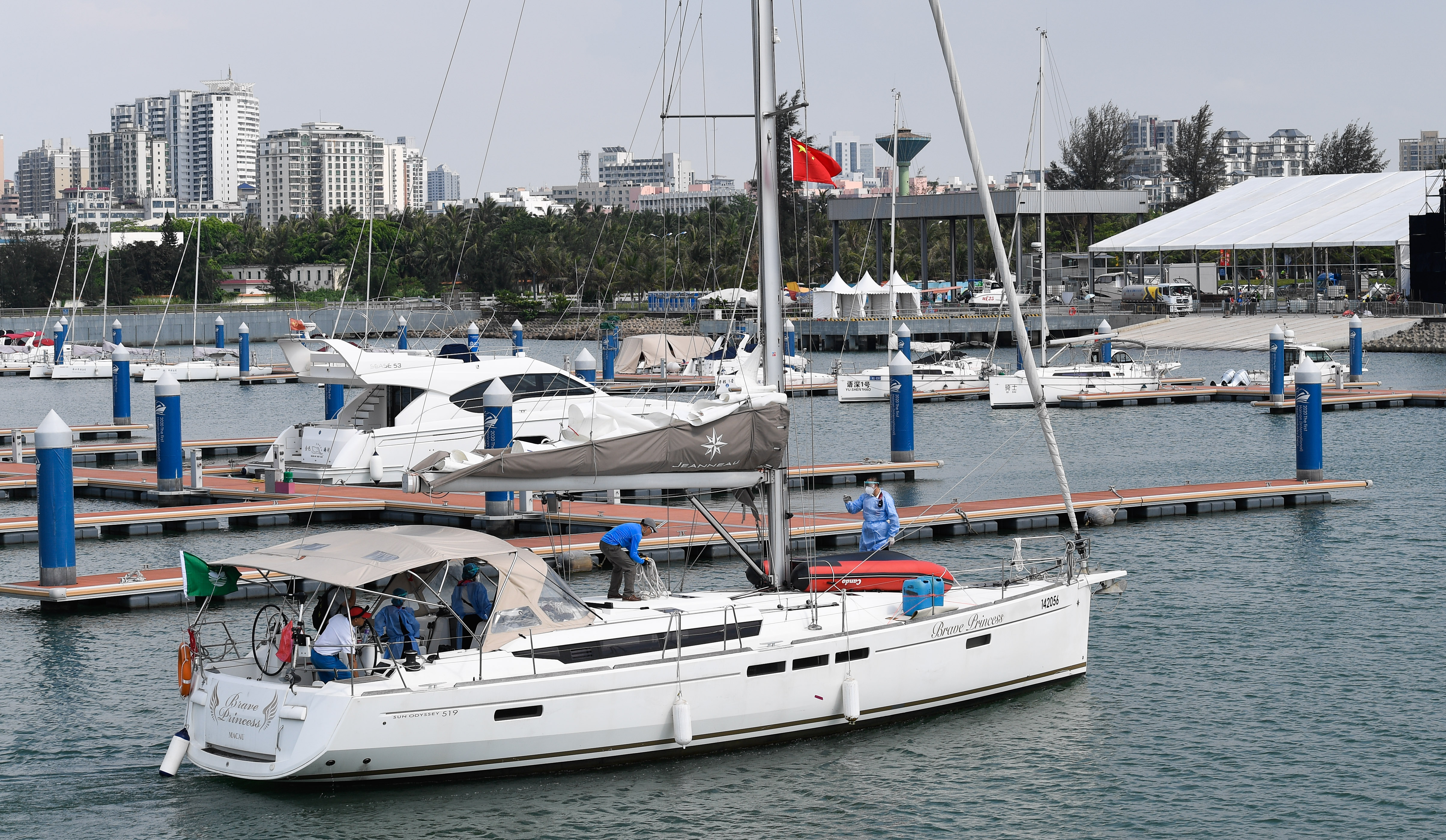 图为4月30日参加消博会游艇展的首艘境外游艇抵达海口,进入海口国家帆船基地公共码头。新华社记者杨冠宇摄