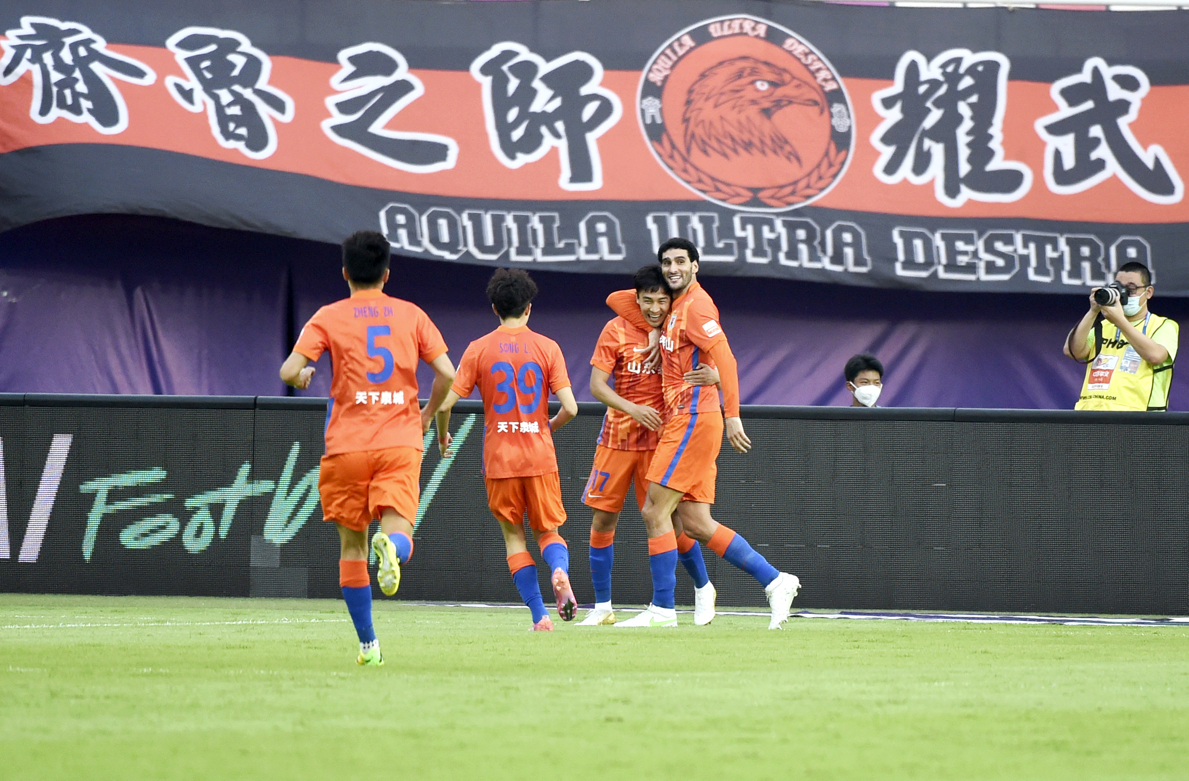 5月8日,山东泰山队球员吴兴涵(前右二)与队友在比赛中庆祝进球。新华社记者 卢汉欣 摄