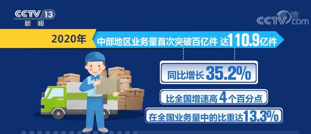 国家邮政局数据显示,2020年,中部地区业务量首次突破百亿件,达110.9亿件,同比增长35.2%,比全国增速高4个百分点,在全国业务量中的比重达13.3%。除湖北受疫情影响业务量增速放缓外,中部地区其他省份增速均超2019年,其中山西、河南、江西、湖南、安徽等省持续发力,业务量增速均超40%。