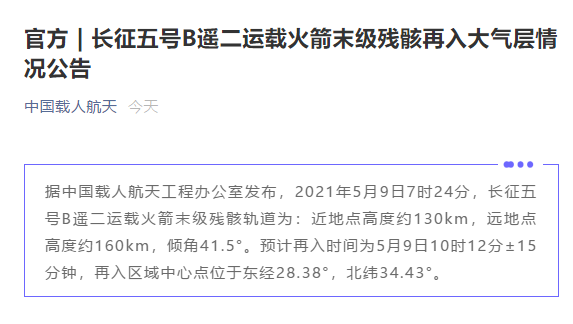 据中国载人航天工程办公室发布,2021年5月9日7时24分,长征五号B遥二运载火箭末级残骸轨道为:近地点高度约130km,远地点高度约160km,倾角41.5°。预计再入时间为5月9日10时12分±15分钟,再入区域中心点位于东经28.38°,北纬34.43°。