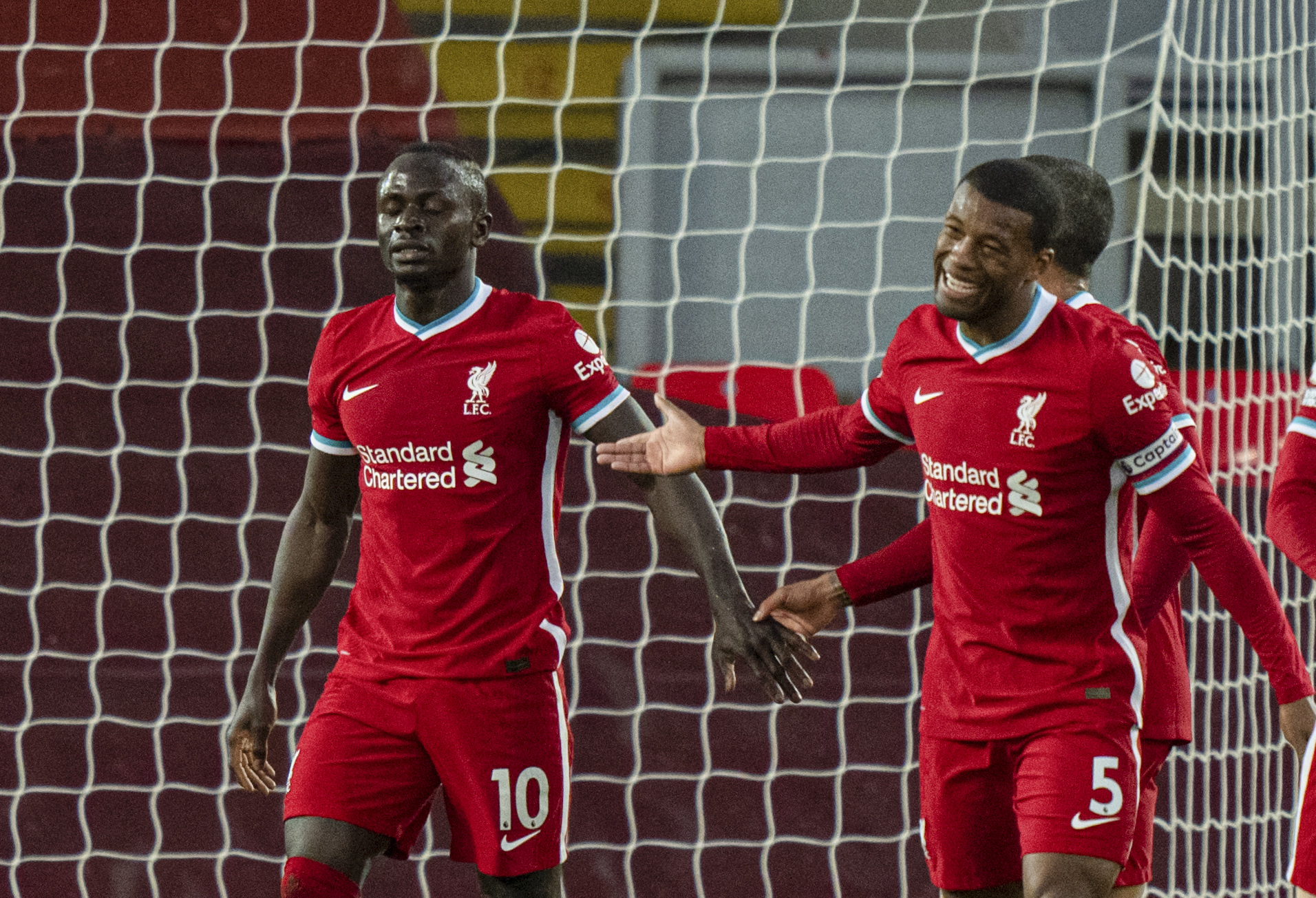 利物浦队球员马内(左)在进球后与队友威纳尔杜姆等庆祝。新华社发(洛克莱夫摄)