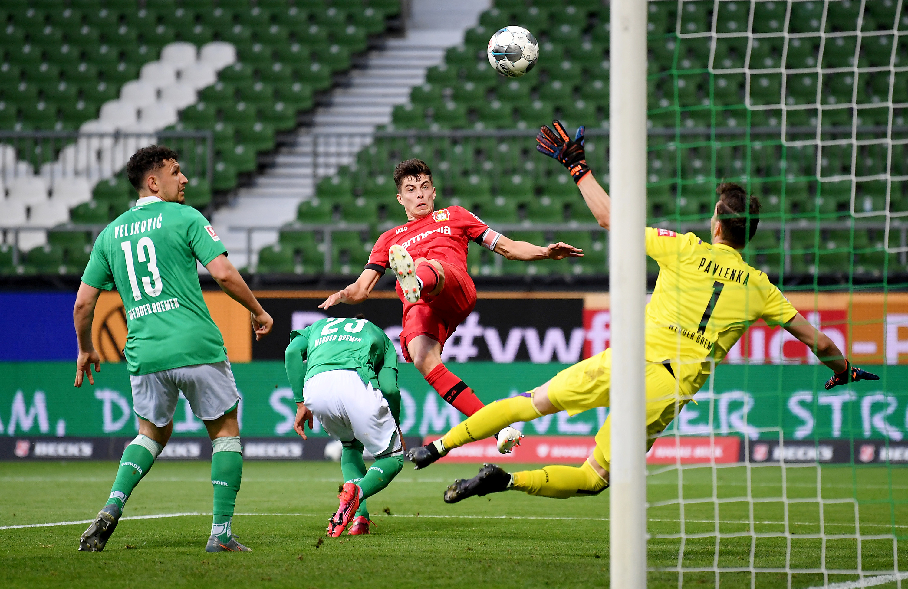 资料图:新星哈弗茨(右二)在比赛中破门。