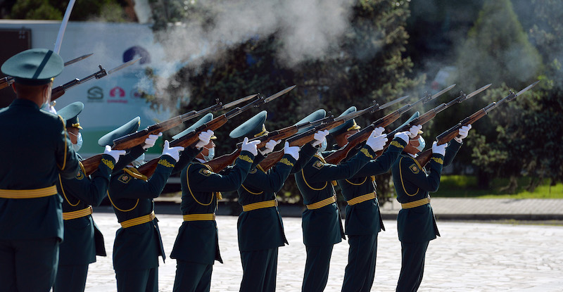 当地时间9日,吉尔吉斯斯坦总统扎帕罗夫在首都比什凯克胜利广场出席纪念伟大卫国战争胜利76周年庆祝活动。他带领内阁政府主要成员等向长明火敬献鲜花,并哀悼一分钟,纪念伟大卫国战争中的受难者。