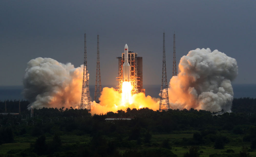 4月29日,搭载着中国空间站天和核心舱的长征五号B遥二运载火箭,在我国文昌航天发射场点火升空。(新华社记者琚振华摄)