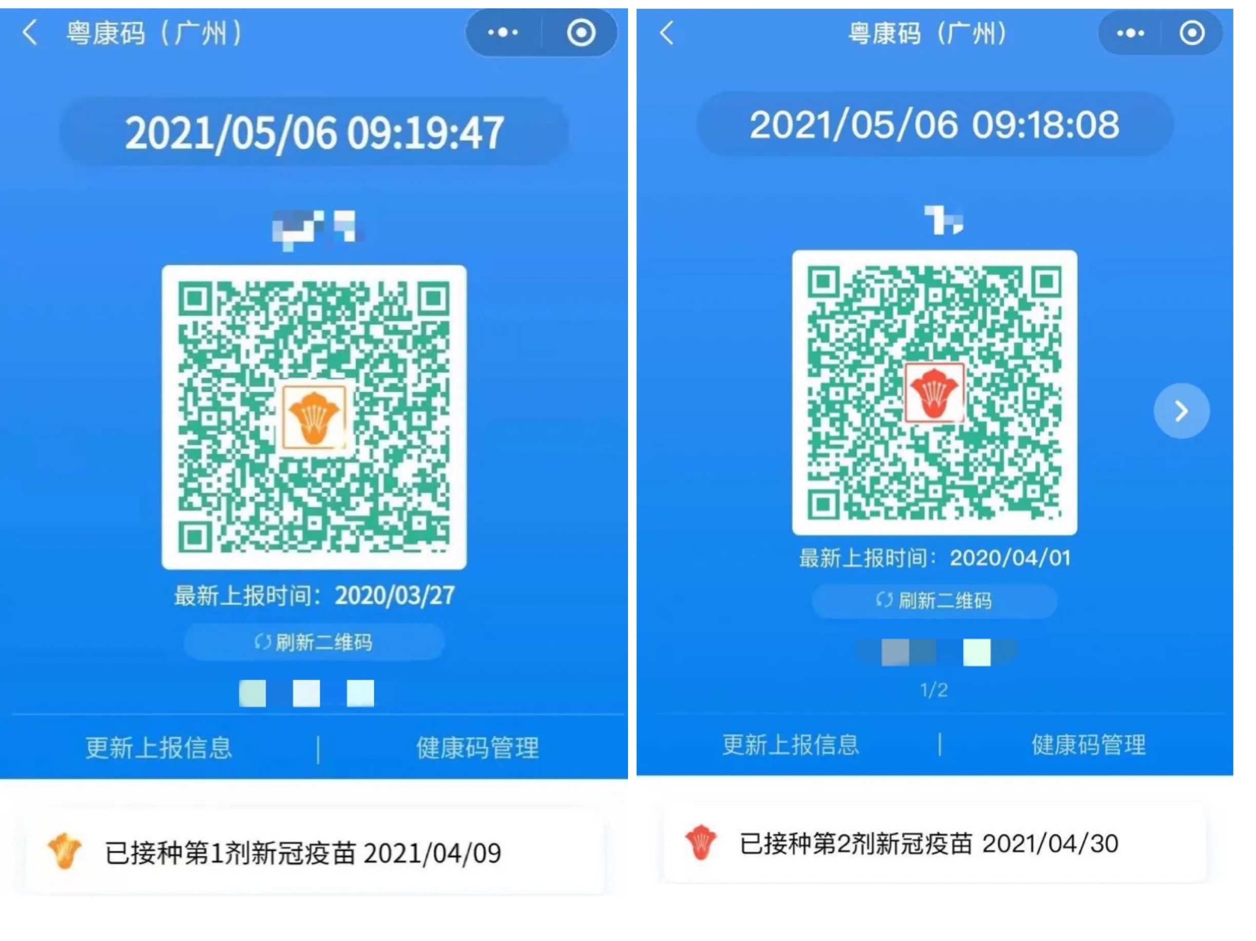 5月5日,广州健康码全新升级,“美颜”亮相。接种完第一剂新冠疫苗,中间将显示有一朵黄色的木棉花,接种完第二剂新冠疫苗,木棉花将由黄色变为红色。二维码下方还将显示已接种针次和接种时间,便于市民查询接种信息。