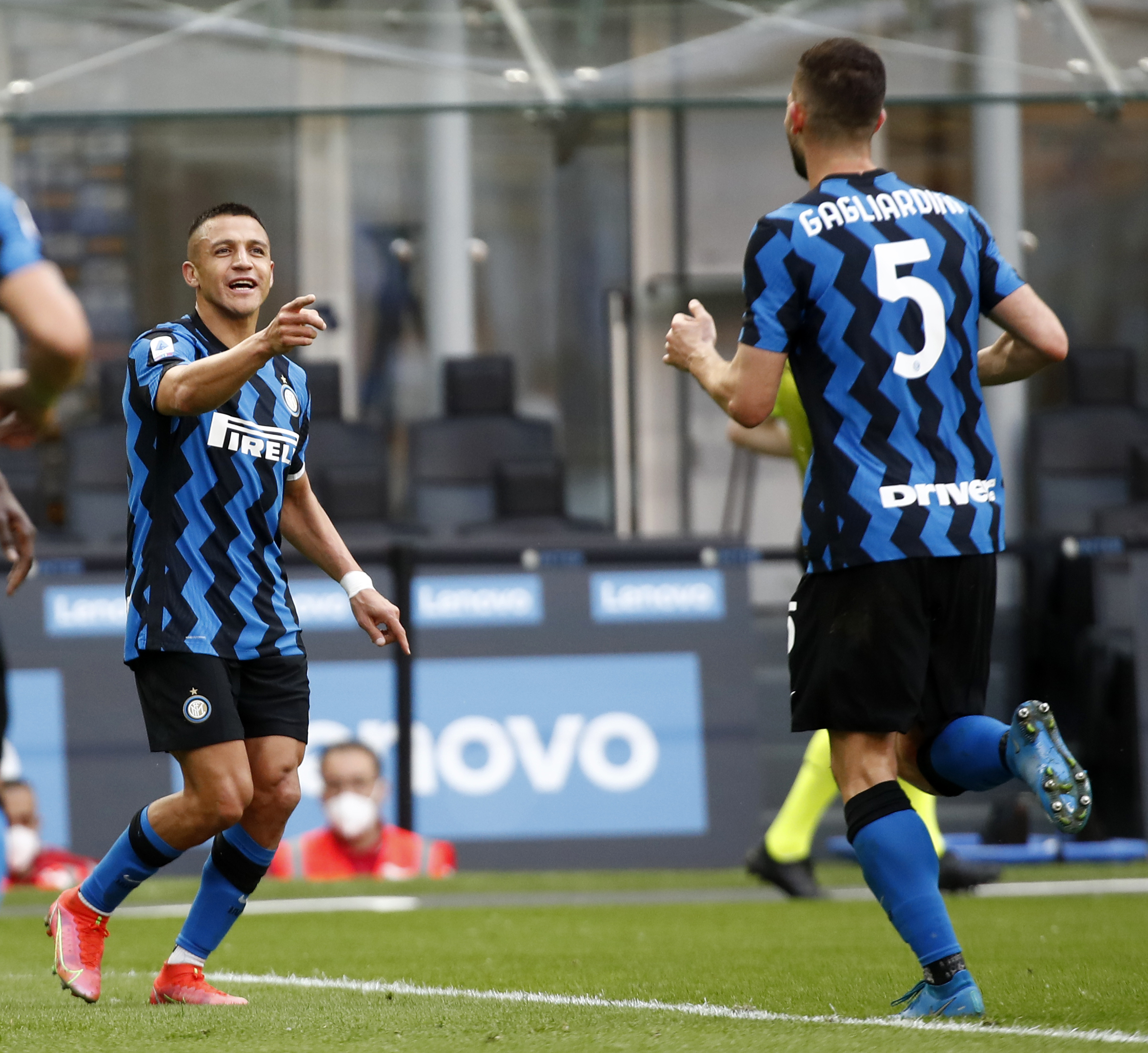 国际米兰队桑切斯(左)庆祝进球。新华社发