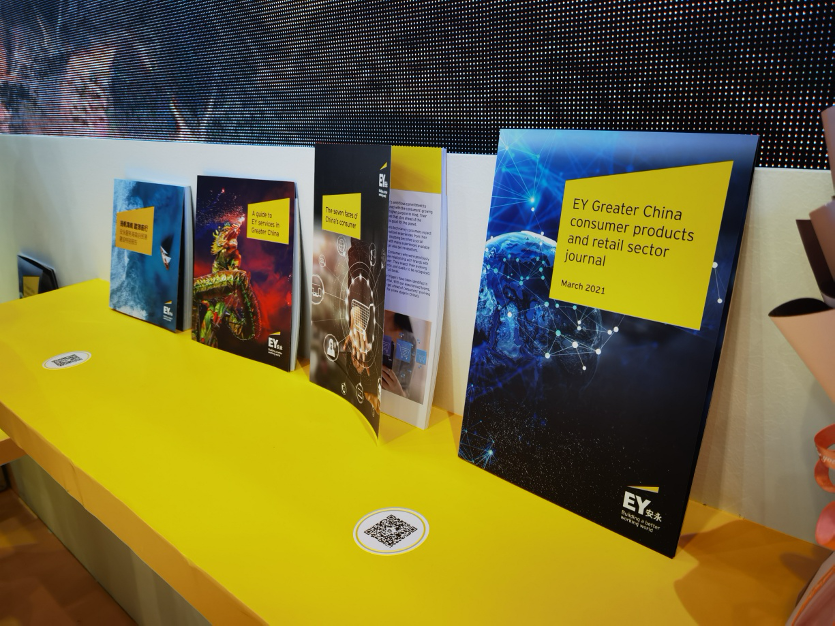 在消博会上,安永(中国)企业咨询有限公司展台摆放着他们针对当前中国消费市场及海南自贸港建设出版的各类报告。新华社记者 王雪摄