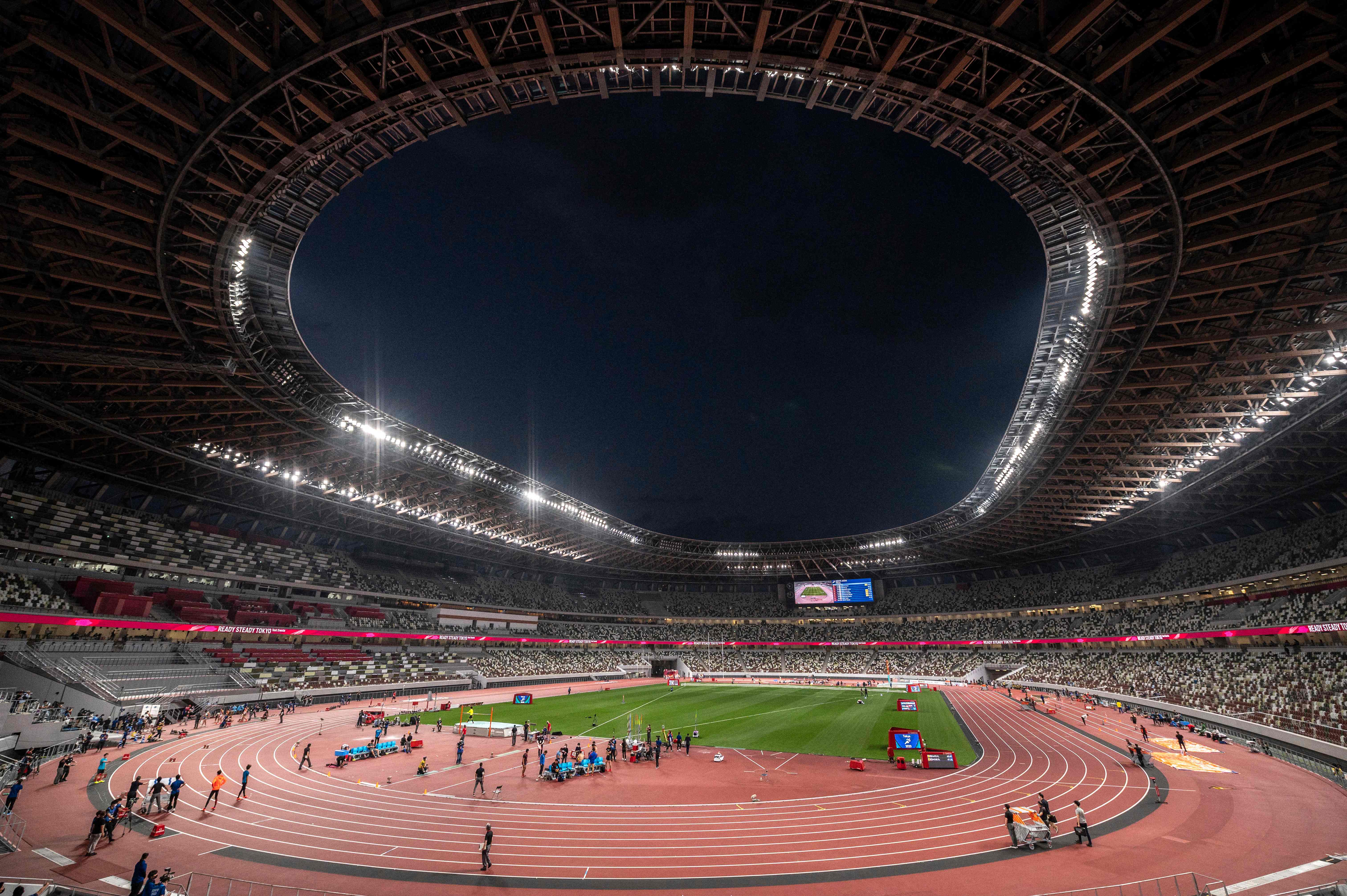 这是5月9日拍摄的东京奥林匹克体育场内进行的东京奥运会田径测试赛现场。