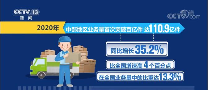 国家邮政局数据显示,2020年,中部地区业务量首次突破百亿件,达110.9亿件,同比增长35.2%,比全国增速高4个百分点,在全国业务量中的比重达13.3%。除湖北受疫情影响业务量增速放缓外,中部地区其他省份增速均超2019年,其中山西、河南、江西、湖南、安徽等省持续发力,业务量增速均超40%。