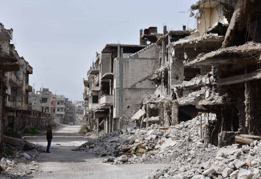 3月11日,叙利亚霍姆斯老人哈迪·古松站在被炸毁的自家房屋前。(新华社发,阿马尔·萨法尔贾拉尼摄)
