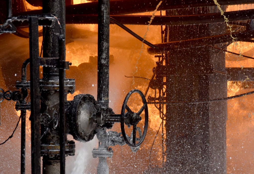 电视画面显示,炼油厂部分区域燃起大火,上空腾起黑烟,消防员在灭火。