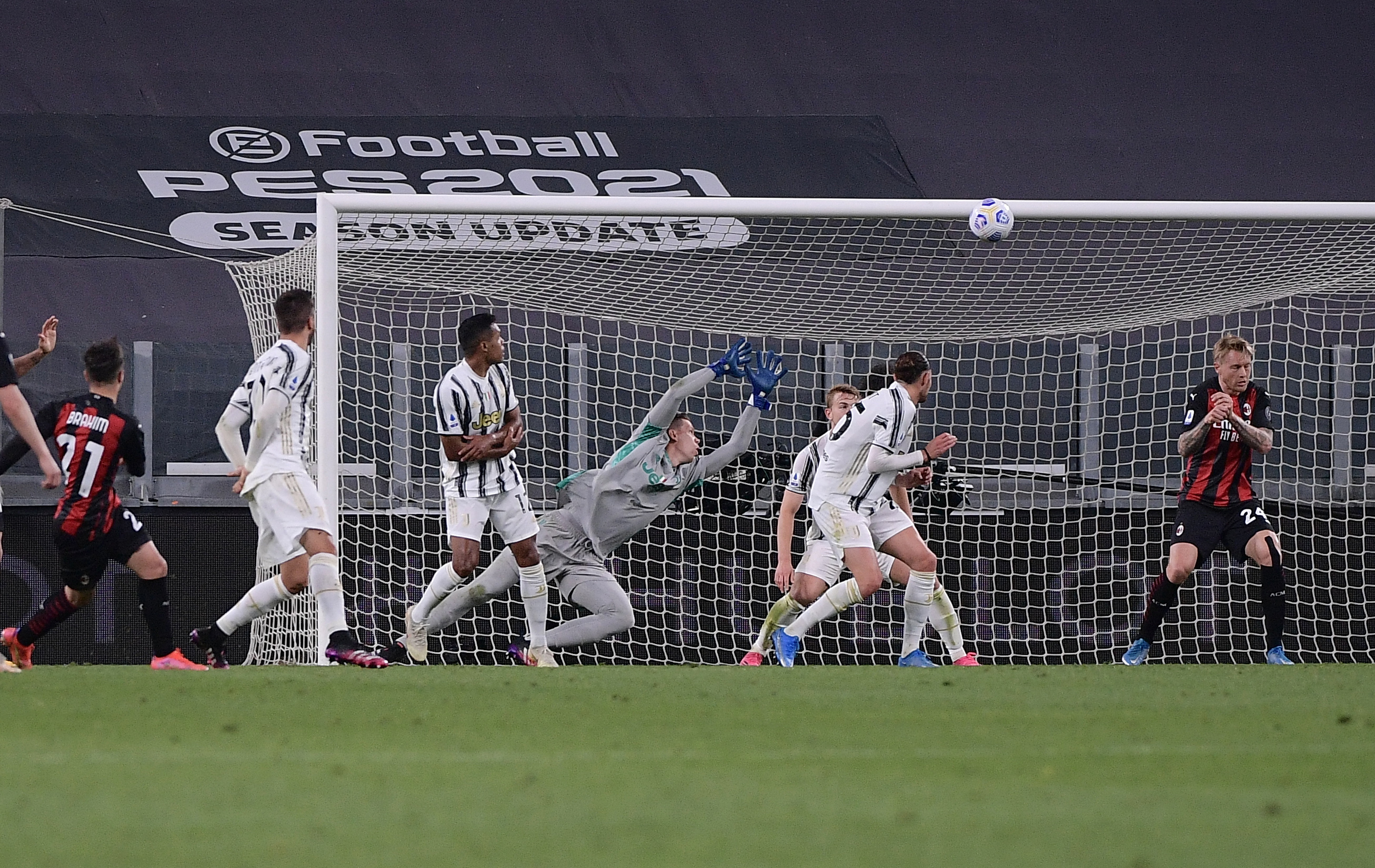 比赛伊始两队互有攻守,却迟迟未能破门,僵局一直持续到上半时补时期间,尤文门将什琴斯尼在阻挡米兰的一次任意球攻门时,未能将球击出禁区,米兰球员迪亚斯控球后找到空档,以一脚精彩的兜射,直挂球门右上死角,为客队先拔头筹。