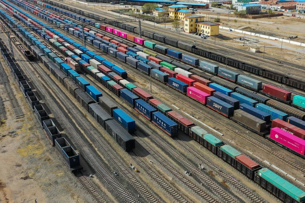 这是4月28日在二连浩特铁路口岸拍摄的待出境集装箱(无人机照片)。(新华社记者刘磊摄)