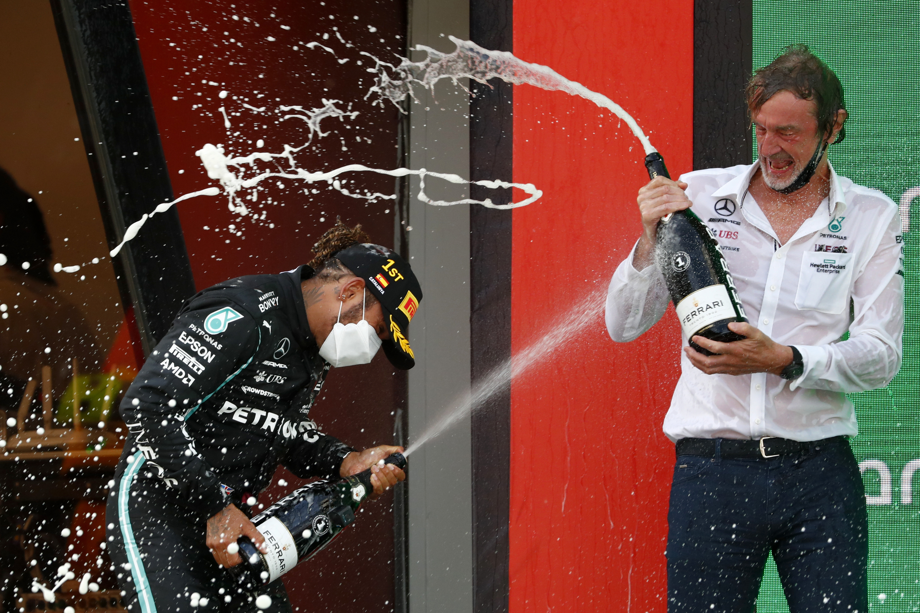梅赛德斯车队英国车手汉密尔顿在颁奖仪式上庆祝。新华社/美联