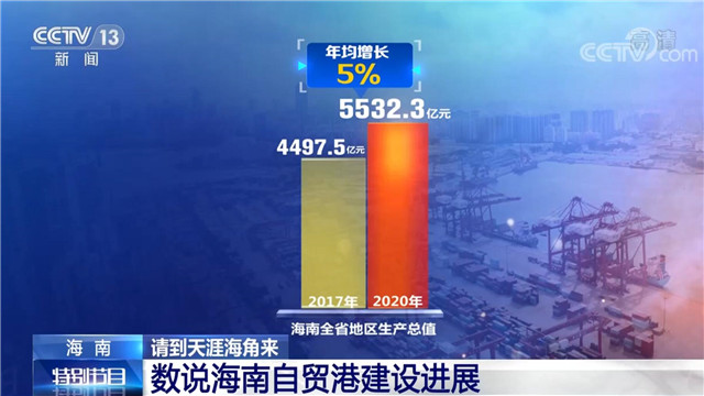 2017年至2020年,海南全省地区生产总值从4497.5亿元增长到5532.3亿元,年均增长5%,投资与GDP之比从91.7%下降到62.7%,发展质量稳步提高。