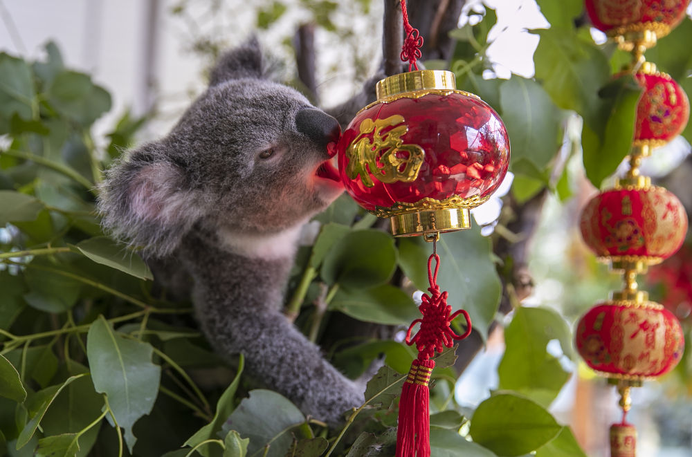 2021年2月2日,澳大利亚悉尼野生动物园的考拉栖息树上挂着中国农历春节装饰。(新华社记者白雪飞摄)