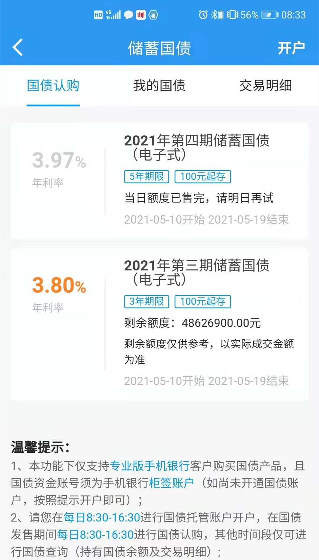 日前,财政部和中国人民银行联合印发通知,5月10日至19日发行的2021年第三期和第四期储蓄国债(电子式)推出手机银行代销渠道。中国工商银行、中国邮政储蓄银行、招商银行、江苏银行四家银行率先试水,通过其手机银行代销。