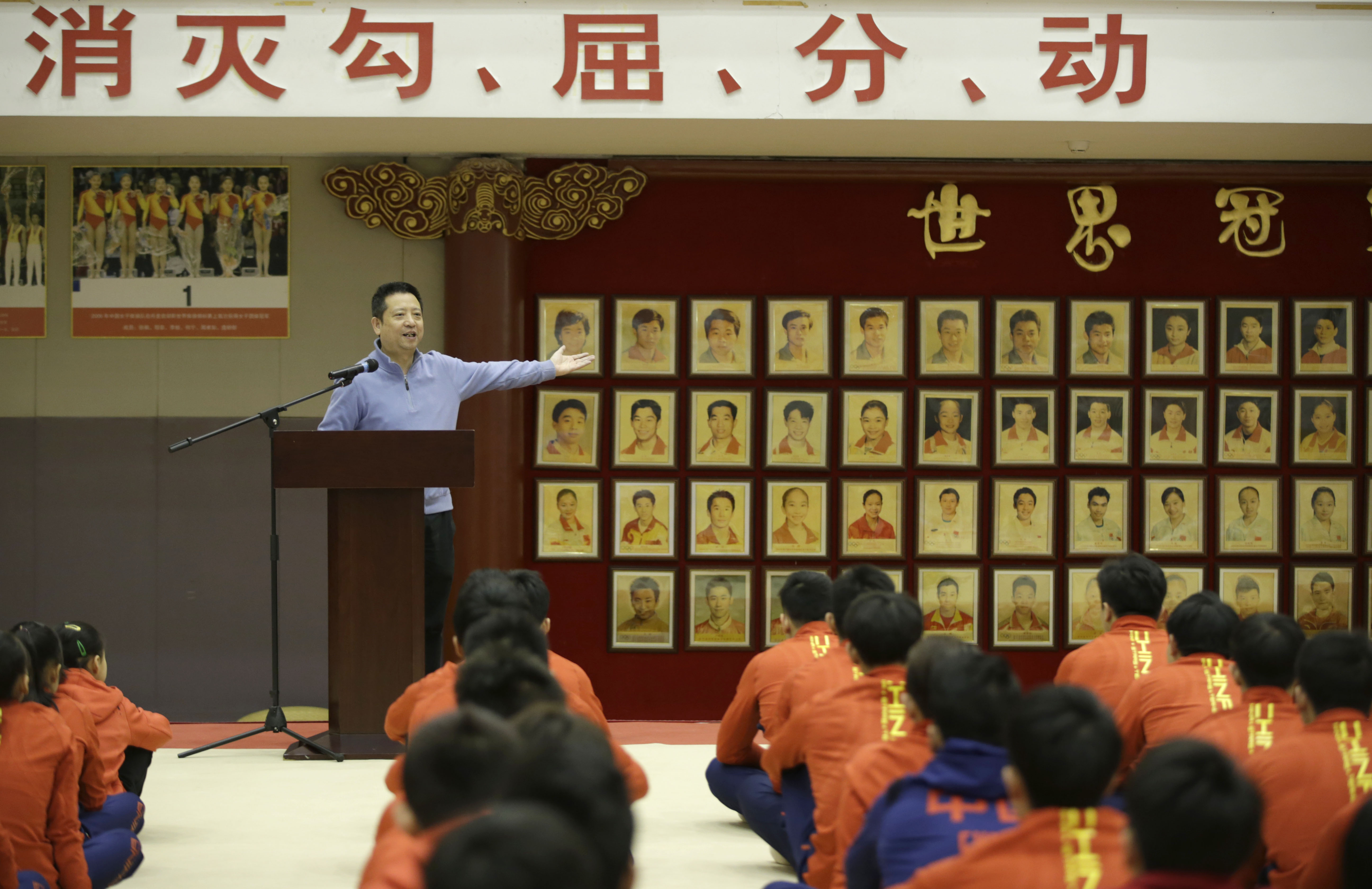 资料图:国家体育总局体操运动管理中心主任缪仲一在训练前鼓舞士气。新华社记者丁旭摄