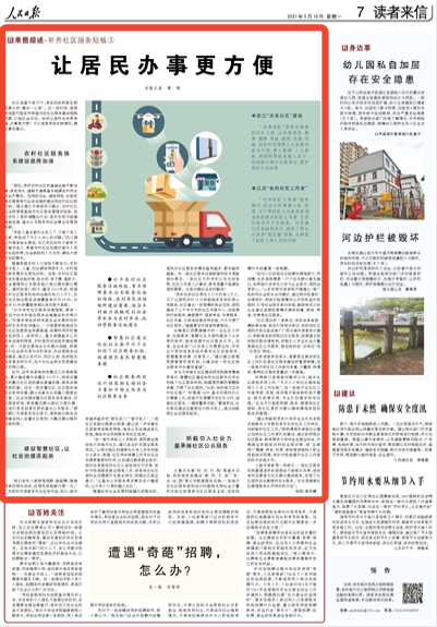 社区连着千家万户,是党和政府联系服务群众的“最后一公里”。近一段时间,读者来信版刊登系列报道关注社区服务建设短板问题,引起社会关注。如何让居民生活更幸福、办事更方便?不少读者来信反映情况,提出意见建议。