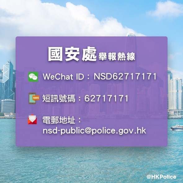 警务处当日在社交平台发表帖文,感谢各位曾经透过热线提供资料的市民,愿意尽公民责任,为维护国家安全出一份力。