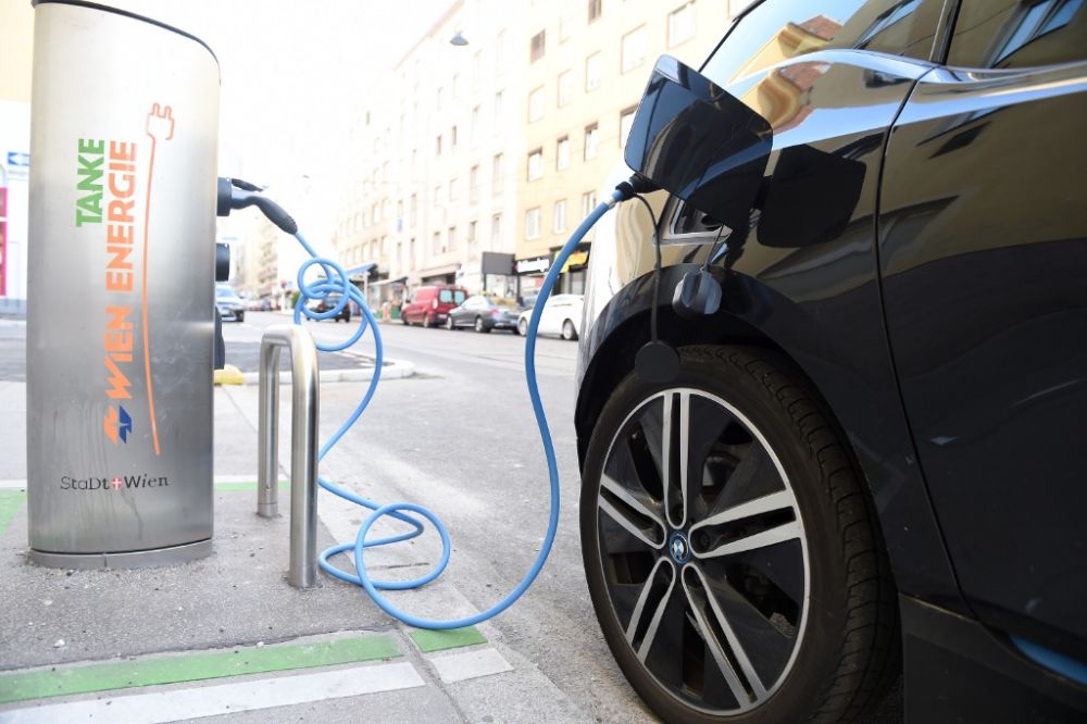 2020年7月14日,一辆纯电动汽车在奥地利维也纳街头用公共充电桩充电。(新华社记者郭晨摄)