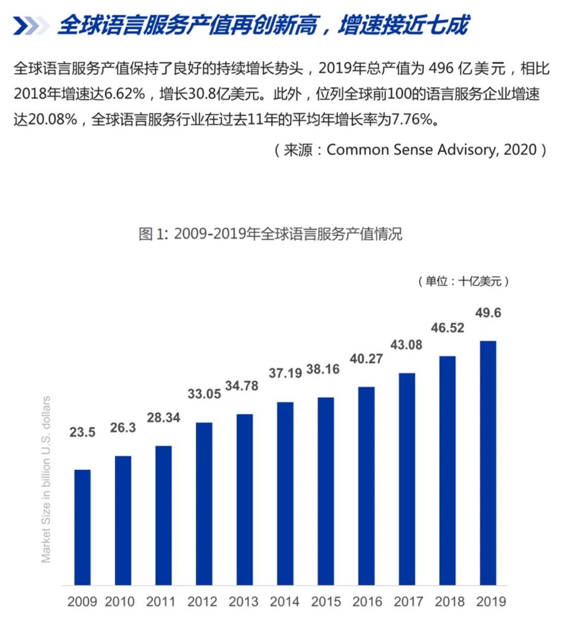 据统计,2019年全球语言服务产值首次接近500亿美元,中国含有语言服务的在营企业403095家,语言服务为主营业务的在营企业8928家,总产值为384亿元,年增长3.2%。英语、日语、德语、法语和俄语等常用语种为翻译量排名前五位的语种。