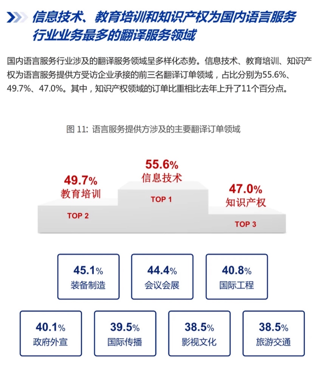 报告称,信息技术、教育培训和知识产权为国内语言服务行业主要翻译服务领域。翻译人才的队伍建设备受重视,翻译人才评价体系更加健全,翻译资格考试累计报名135万人次。互联网技术支持下的远程语言服务活动成为新常态。