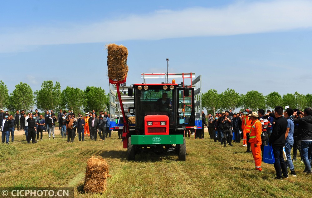 ↑2021年5月10日,在河北省农机推广“田间日”活动上,参会厂家进行草捆捡拾机作业演示。CICPHOT0/苑立伟 摄