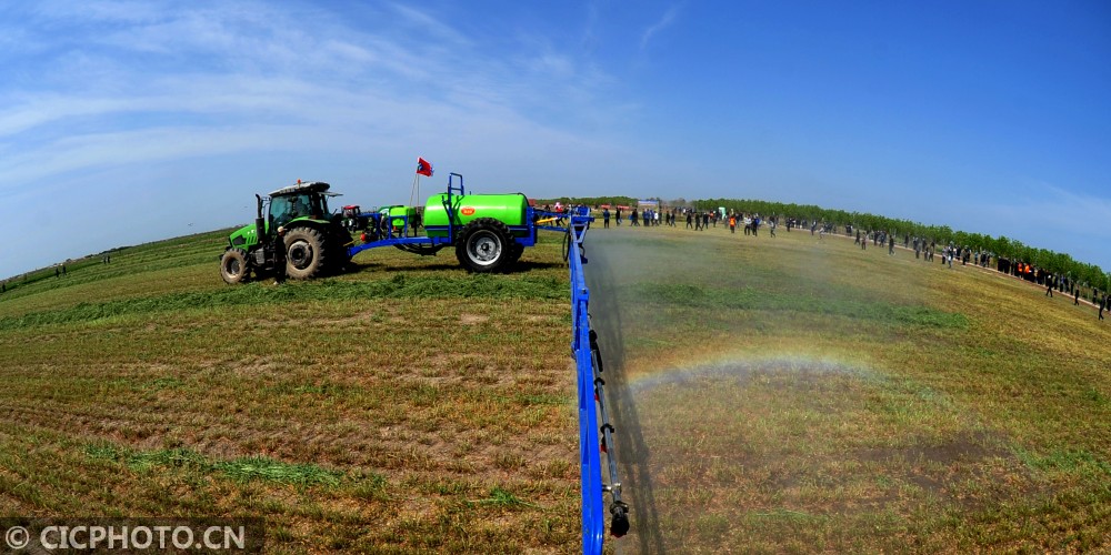 ↑2021年5月10日,在河北省农机推广“田间日”活动上,参会厂家进行牵引式喷雾机作业演示。CICPHOT0/苑立伟 摄