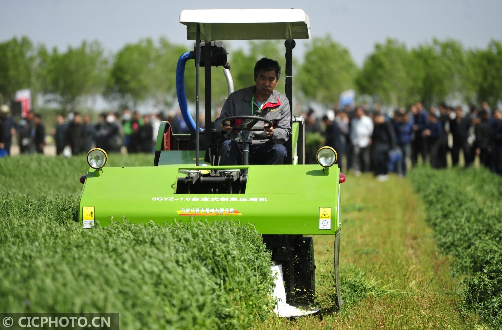↑2021年5月10日,在河北省农机推广“田间日”活动上,参会厂家演示自走式割草压扁机的使用。CICPHOT0/苑立伟 摄