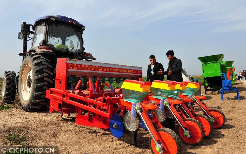 ↑2021年5月10日,在河北省农机推广“田间日”活动开始前,参会厂家在做春玉米全株青贮起垄覆膜播种机展示前的准备工作。CICPHOT0/苑立伟 摄
