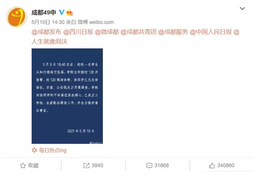 5月9日18时许,成都市四十九中一名学生坠楼身亡,引发舆论关注。截至10日深夜,面对汹汹舆情,校方只发布了一份避重就轻的情况通报,并未向家长和公众提供有关事故原因的说法。