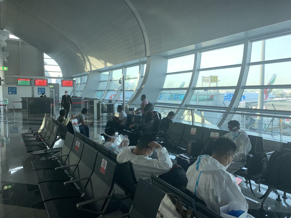 4月25日,身穿防护服的中国电力建设集团员工在阿联酋迪拜国际机场候机。新华社记者张淼摄