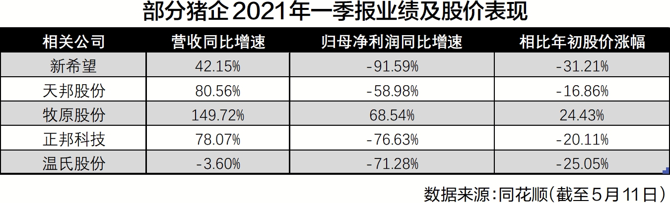 从相关公司股价走势看,截至5月11日收盘,新希望股价较年初下跌31.21%,天邦股份股价较年初下跌16.86%,牧原股份较年初上涨24.43%,其中新希望股价较2020年高点已“腰斩”。