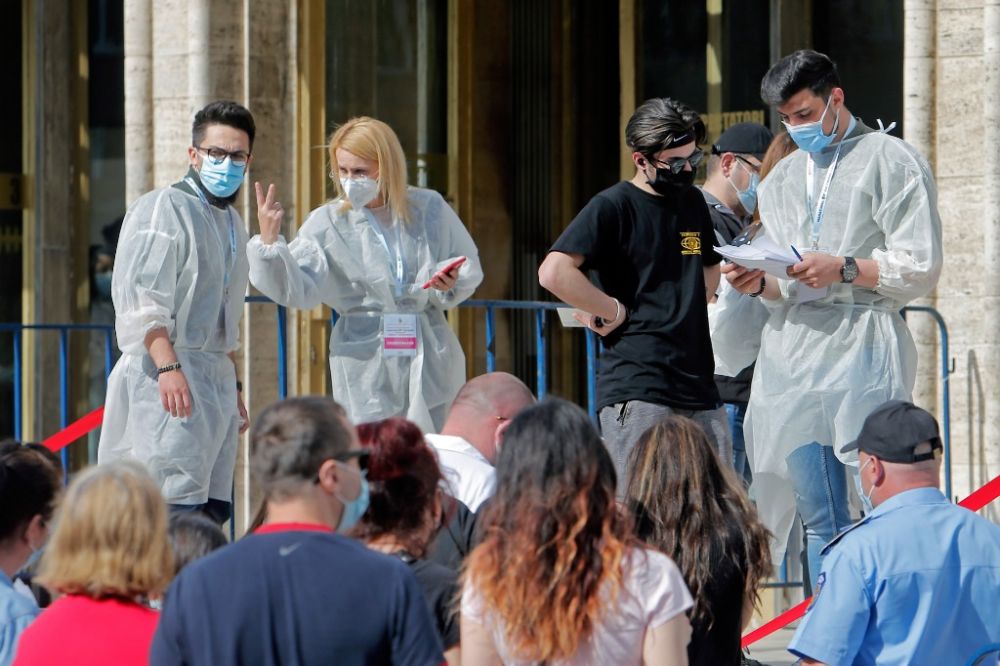 5月7日,市民在罗马尼亚首都布加勒斯特的王宫大会堂外排队等待接种疫苗。(新华社发,克里斯泰尔摄)