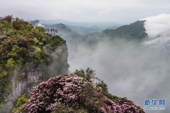 初夏时节,位于陕西省汉中市南郑区的龙头山景区成片的高山杜鹃竞相开放,与翻腾变幻的云海相映衬,更显娇艳,吸引众多游人前往观赏。