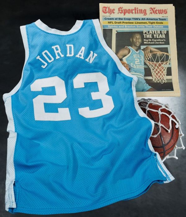 乔丹曾穿着这件蓝白色23号球衣拍摄美国《体育新闻》周刊封面照片。当时,他获选为美国大学体育协会(NCAA)年度最佳球员。