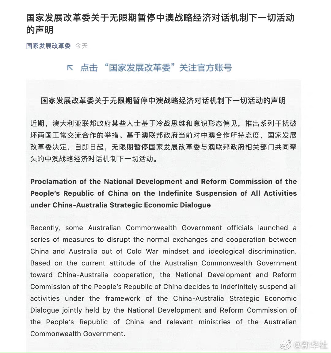 “自即日起,无限期暂停国家发展改革委与澳联邦政府相关部门共同牵头的中澳战略经济对话机制下一切活动。”