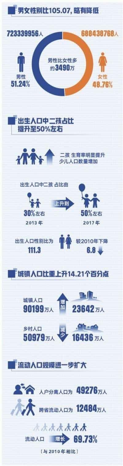 从性别结构看,男女比例持续改善。我国男性人口为72334万人,占51.24%;女性人口为68844万人,占48.76%。总人口性别比为105.07,与2010年基本持平,略有降低。