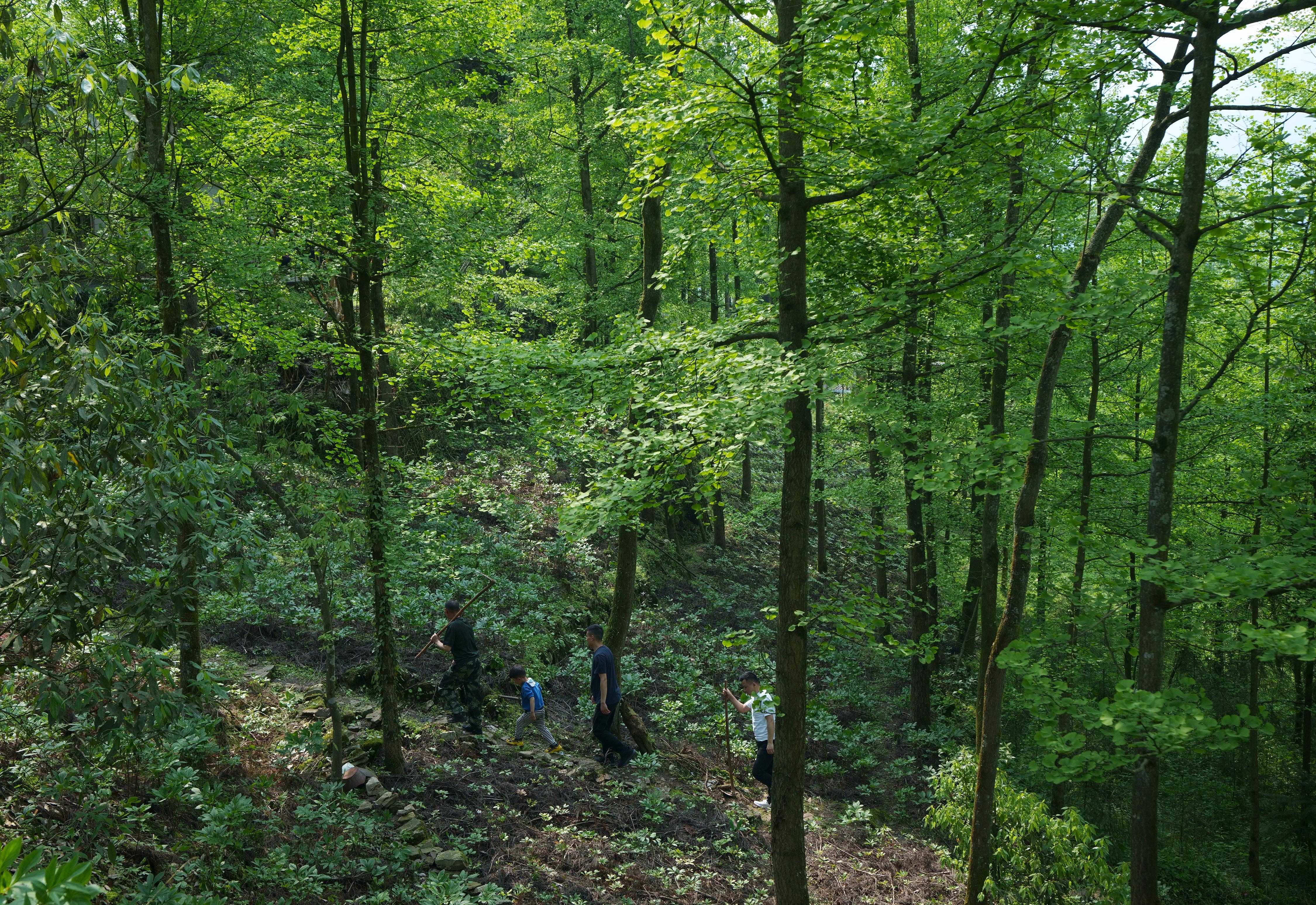 ↑5月4日,林兴聪(左一)带着儿孙们去地里劳动。